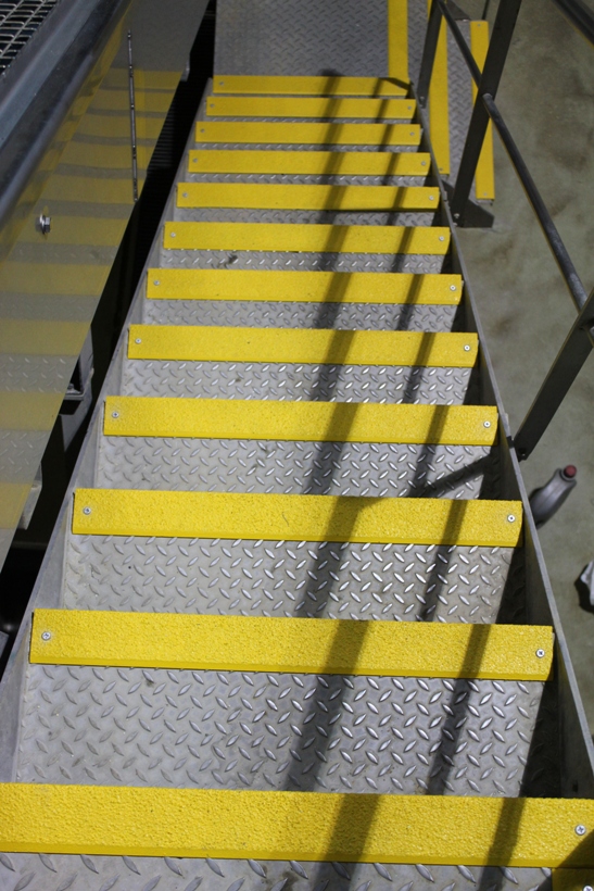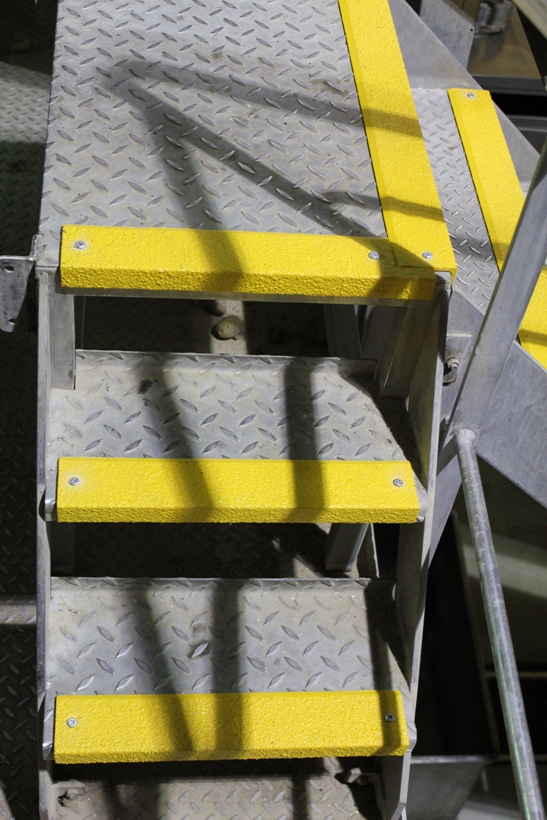 Ολοκληρώθηκε η τοποθέτηση αντιολισθητικών ενισχύσεων από Fiberglass (GRP) στις περιοχές που παρουσίαζαν κίνδυνο ολίσθησης σε Εργοστάσιο τροφίμων. Σχεδόν όλες οι σκάλες στην γραμμή παραγωγής του Εργοστασίου είναι κατασκευασμένες από ανοξείδωτη ‘κριθαρωτή’ λαμαρίνα, η οποία σε συνδυασμό με υπολείμματα όπως λάδι ή νερό, δημιουργούσε κινδύνους ατυχήματος. Για τη βελτίωση της υφιστάμενης κατάστασης και την αποφυγή κάποιου σοβαρού περιστατικού επιλέχθηκαν προϊόντα GRP της Evergrip: καλύμματα σκαλοπατιών σε μαύρο χρώμα, καλύμματα βαθμίδας σκάλας σε κίτρινο χρώμα, ρίχτι σκαλοπατιού σε κίτρινο χρώμα καθώς και GRP επίπεδο φύλλο σε μαύρο χρώμα για την κάλυψη επίπεδων επιφανειών.